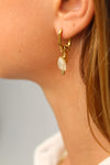 Les boucles transformables Amandine associent de petites créoles rectangulaires dorées à des pierres citrine montées en pendentif. À porter avec ou sans la pierre, pour un style minimaliste ou plus lumineux.