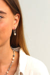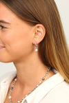 Les boucles transformables Océane se composent de petites créoles rectangulaires argentées associées à des perles d’eau douce montées en pendentif.