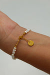 Nettoyez ponctuellement votre bijou avec un chiffon doux pour raviver son éclat. Évitez les produits abrasifs afin de préserver la brillance des perles et de l’acier doré.