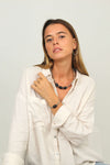 Le bracelet Jade combine des disques de jaspe dalmatien à une pierre noire cylindrique centrale, pour un style équilibré et moderne.