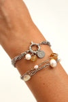 Le bracelet transformable Claire alterne plusieurs chaînes argentées et deux pendentifs délicats : une perle d’eau douce et une pierre citrine. Une pièce élégante, fluide et déstructurée, avec un rendu lumineux et contemporain.