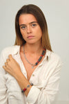 Le bracelet transformable Tess associe la puissance des pierres grises cylindriques à trois disques de corail rouge qui apportent une touche colorée éclatante.