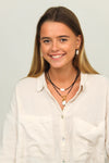 Le collier Alizée combine l’intensité moderne des perles noires carrées en verre facetté avec l’éclat doux d’une perle d’eau douce plate, placée en pièce centrale. Le contraste entre le noir profond et le blanc nacré crée une harmonie visuelle élégante, simple et ultra raffinée.