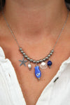 Le collier Barbara associe la profondeur du lapis lazuli, la douceur des perles d’eau douce, l’éclat de la céramique, et des pendentifs fantaisie inspirés de la mer.