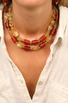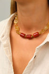 Le collier Édith marie l’intensité d’une pierre rouge brique cylindrique à la luminosité vibrante de la citrine.