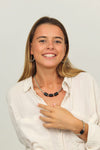 Le collier Jade associe des disques de jaspe dalmatien, reconnaissables à leurs taches naturelles uniques, à trois pierres noires cylindriques placées au centre.