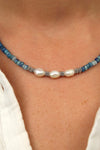 Le collier Jeanne associe la douceur des perles d’eau douce aux nuances vibrantes de l’agate bleue, montées sur une fine chaîne argentée.