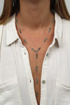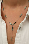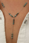 Le collier Perrine associe la modernité de l’acier inoxydable argenté à la richesse des nuances de la turquoise africaine, dans un design cravate raffiné.