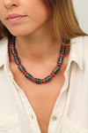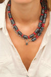 Le collier Tess joue sur les contrastes forts : de grosses pierres grises cylindriques, intenses et minérales, associées à des disques de corail rouge éclatants. L’alternance des formes et des couleurs crée un bijou audacieux, structuré et moderne.