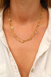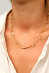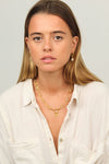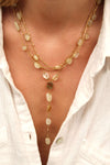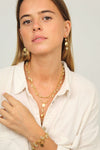 Le collier transformable Amandine se compose de chaînes dorées fines mêlées à des pierres citrine. Son design multi-rangs crée un effet habillé mais délicat, lumineux sans jamais être trop présent.