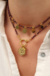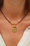 Le collier transformable Flavie mêle la profondeur du grenat à la lumière du doré. Ses perles facettées encadrent un grand pendentif rosace, qui attire naturellement le regard. Une pièce audacieuse mais toujours raffinée.